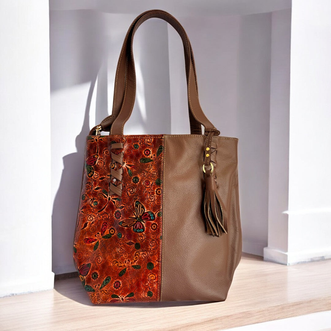 Sumérgete en la belleza de la naturaleza con este exclusivo bolso de cuero, pintado a mano y decorado con delicados diseños de mariposas y pequeñas flores. Cada detalle de este bolso refleja la minuciosidad y el arte de la técnica artesanal, lo que convierte a esta pieza en una auténtica obra de arte.